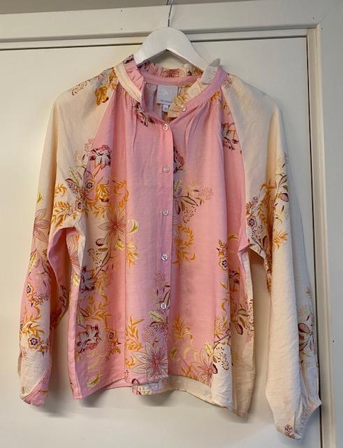Lekker mønstret bluse med en løs fasong. Den har knapper helt ned i front, en liten volang på kraven og strikk nederst på ermet
