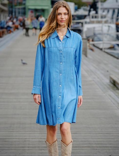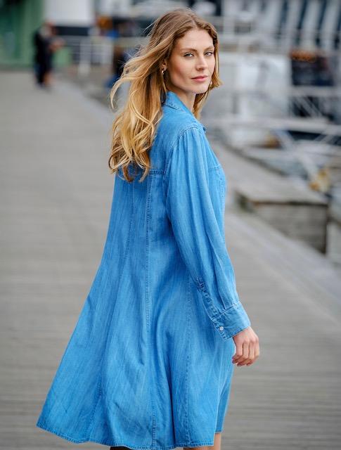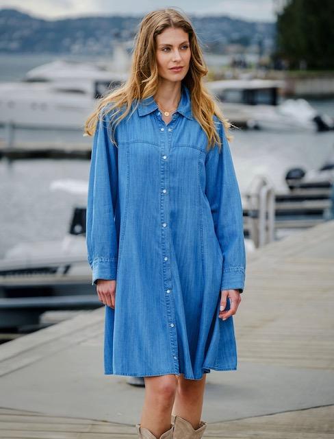 En herlig hverdagskjole. Lget i en myk og lett tencelkvalitet. Kjolen har krage og knapping med emaljerte hvite knapper helt ned. Den har et løst og ledig snitt og lommer i sidene
