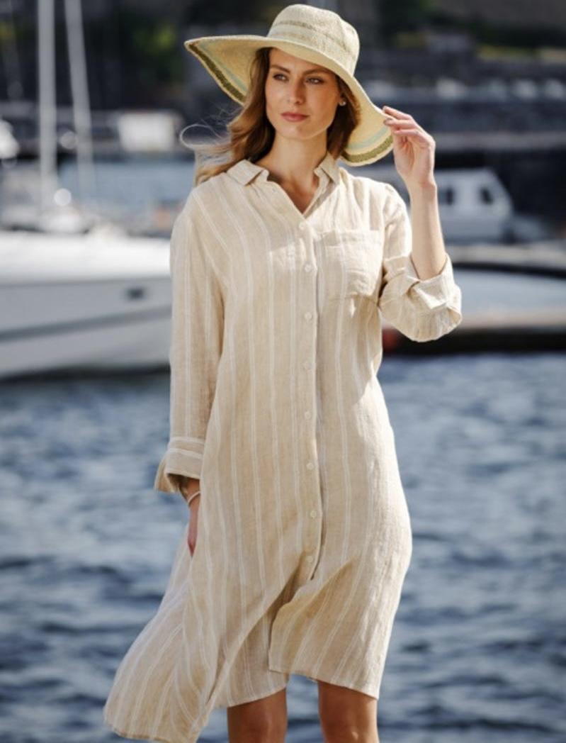Herlig stripete linkjole med krage og knapper i front. Den har brede mansjetter på ermene og lommer i siden. Raus i størrelsen