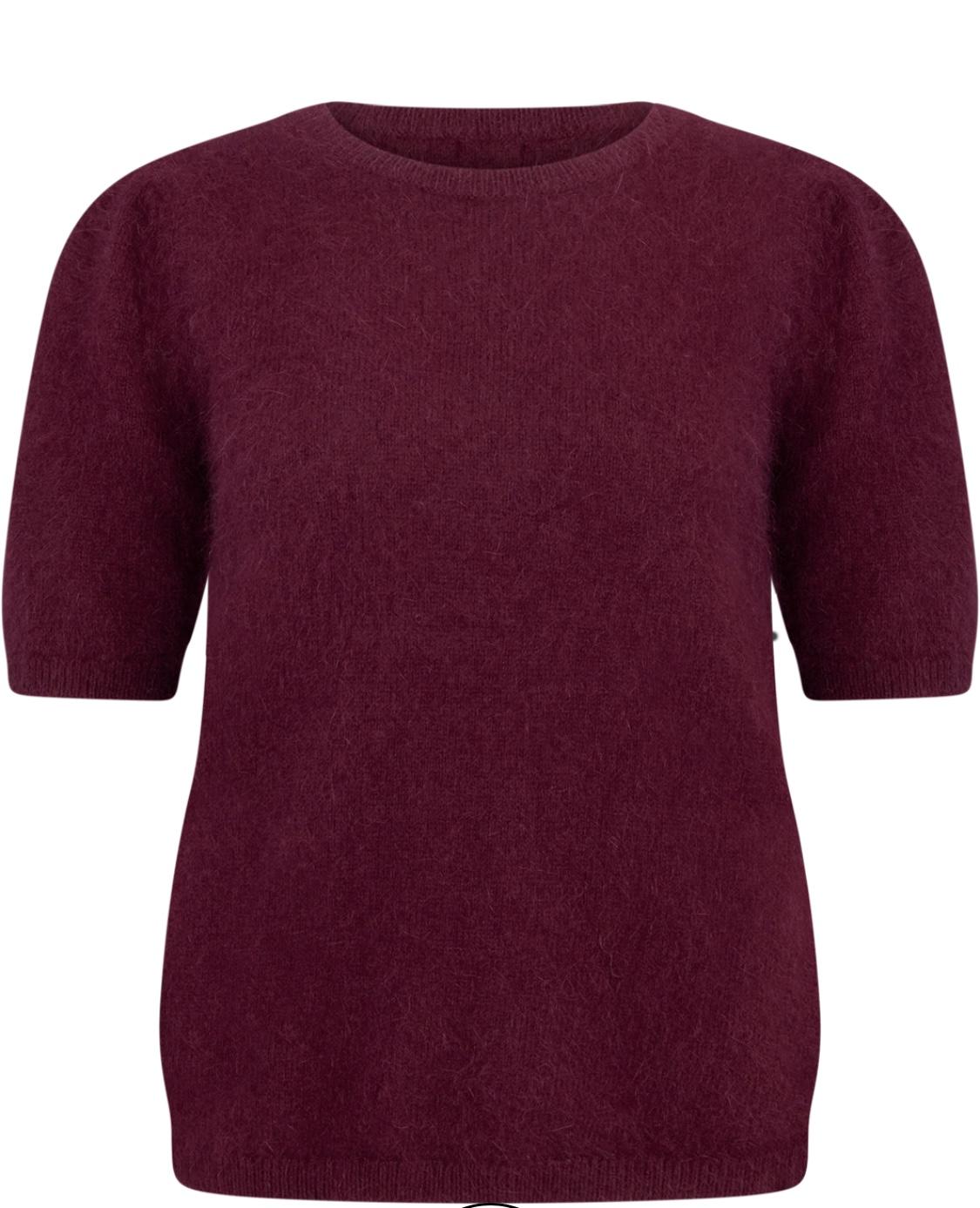 En stilig kortermet angoragenser med lett puff i skuldrene. Den runde halsen er ribbestrikket. Det er også ribbestrikk nederst på erm og bole