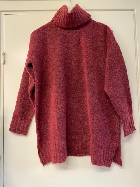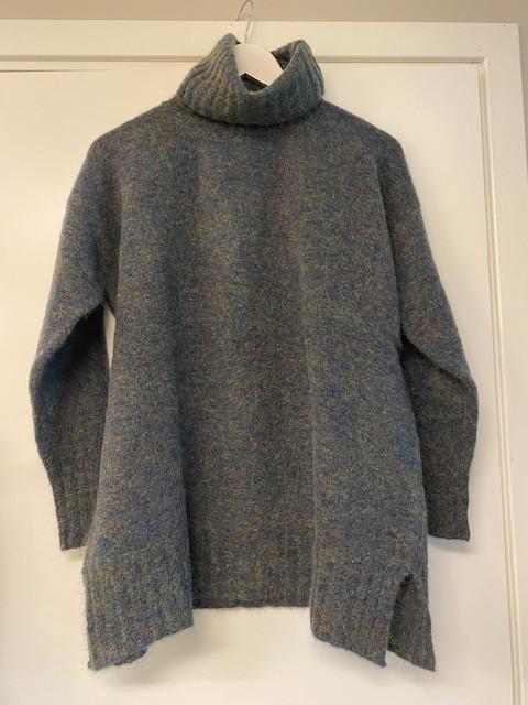 En herlig høyhalset lang ullgenser som går godt ned på rompa. Den har robbestrikk i halsen, og nederst på ermer og bole.