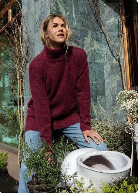 Genseren er laget i 34 % kid mohair, 34 % ull, 27 % polyamid, 5 % elastane