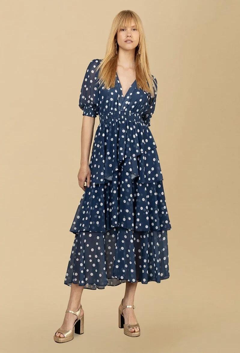 En florlett lekker foret kjole med kledelig v-hals og smocklinning. Den har kort erm med smock nederst. Kjolen har mange kuftige volanger fra livet og ned