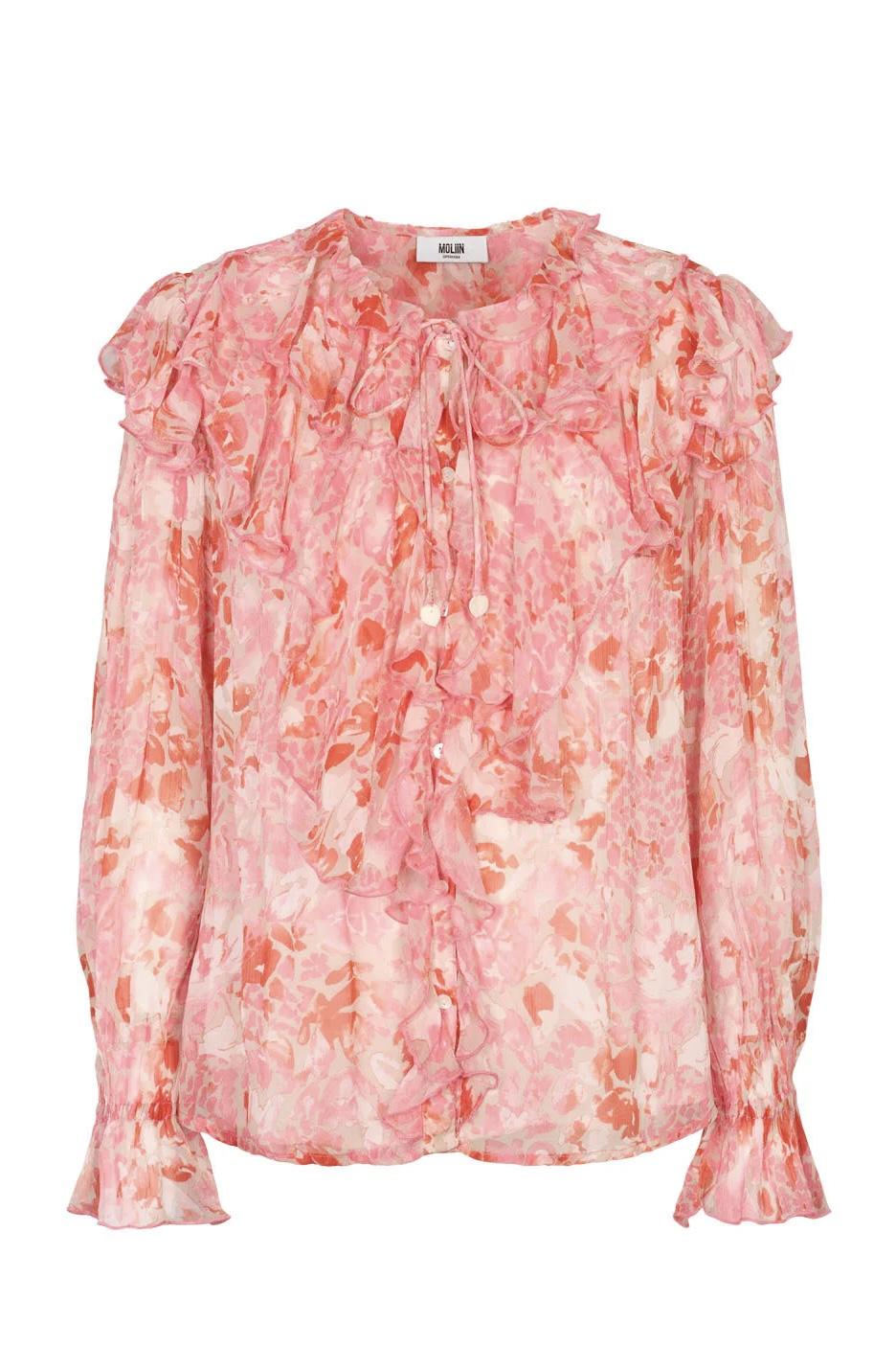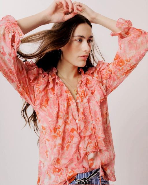 Lekker fargerik lett og luftig bluse som er foret. Den har volanger langs hals og knappestolpe. Knyting i halsen og strikk nederst på erme