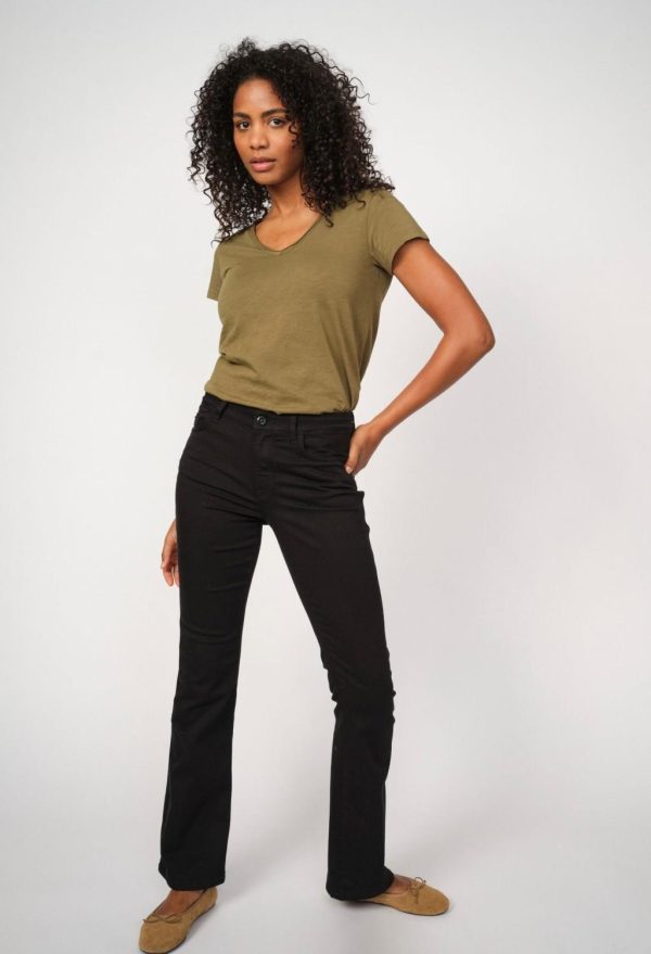 Jeans med høy liv og ben med en anelse kick flare. Jeansen er supermyk og behagelig å ha på. God stretsj. 5 lommer.