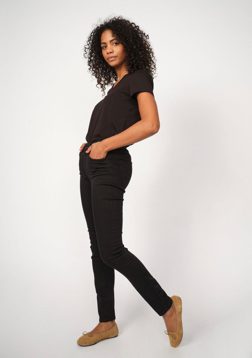 Dette er en figurvennlig jeans med høyt liv. Den er slim fit. Er supermyk og behagelig å ha på. God stretsj. 5 lommer.
