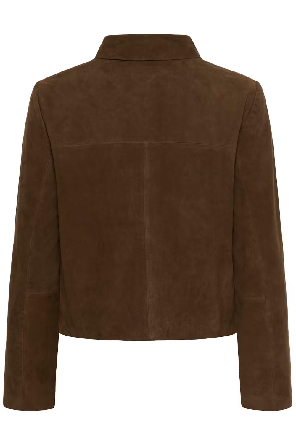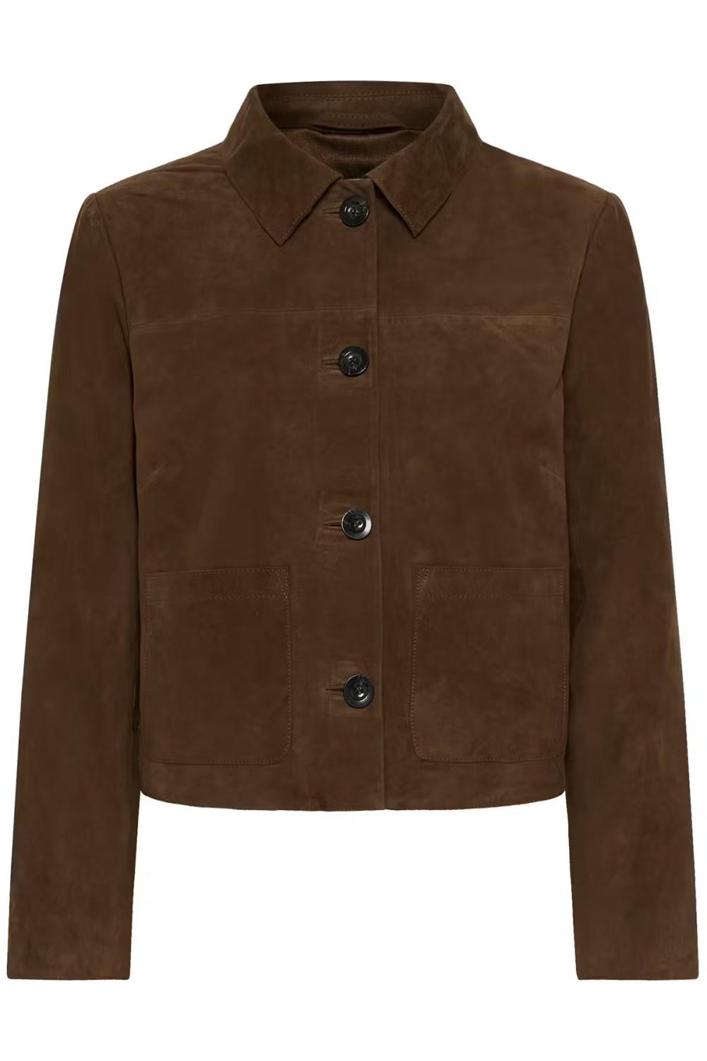 Tøff kort semsket skinnjakke med litt boxy passform. Jakken har krage og knapper i front. Den har påsydde lommer.