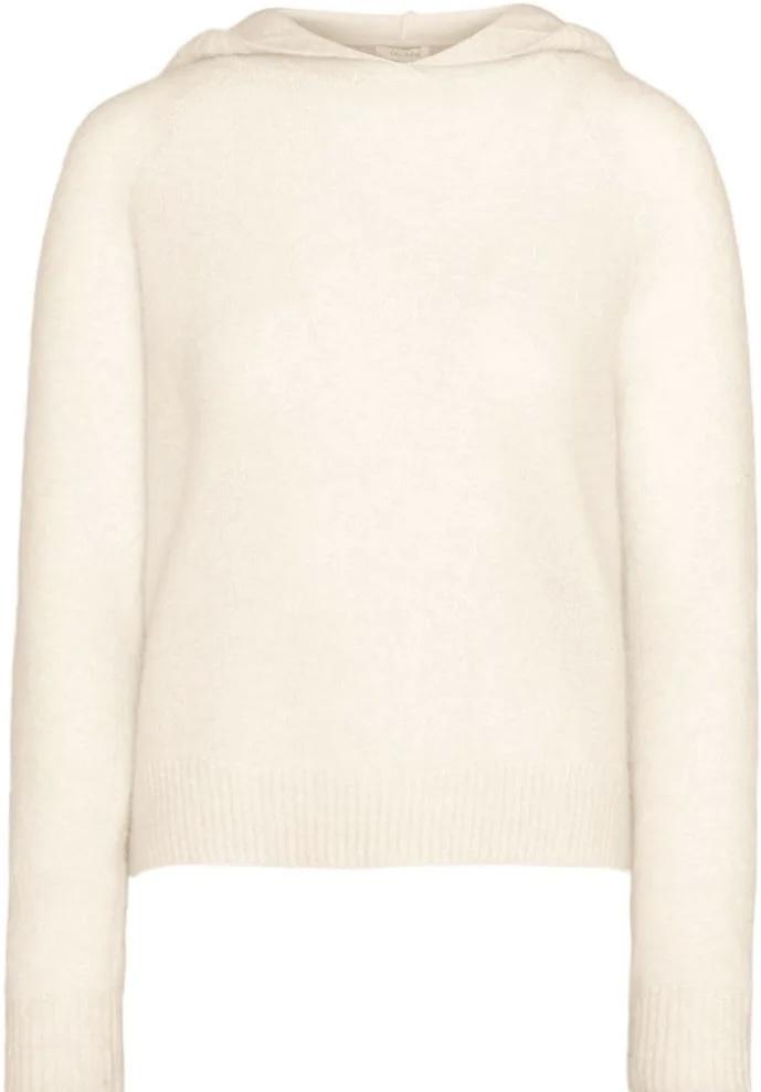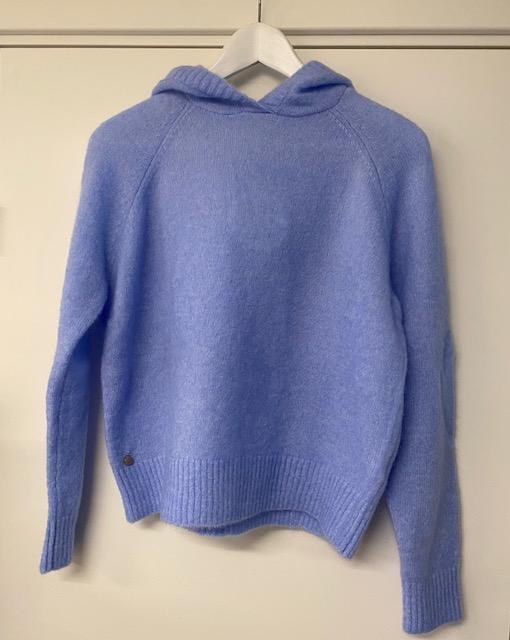 En lett og luftig genser. Den enkle hetten gir genseren et avslappet preg. Genseren er forholdsvis kort. Den har ribbestrikk rundt kanten på hetten og nederst på erme og bole