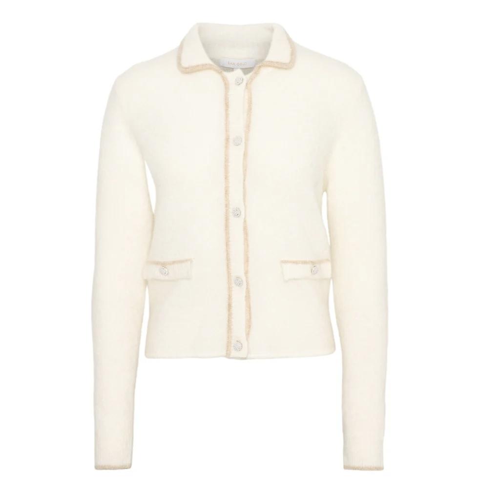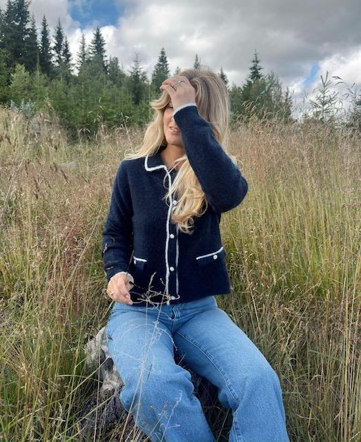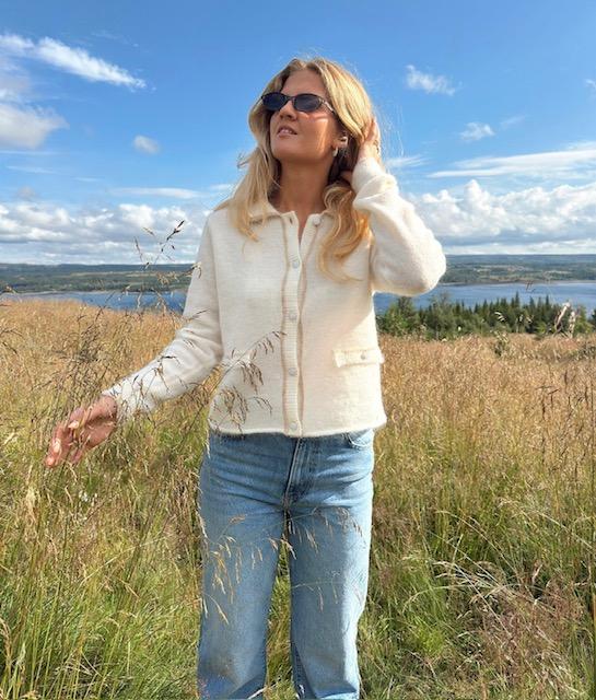 En supermyk og elegant strikkejakke med krage. Jakken har knappestolpe med nydelige perlebesatte knapper og den har to jukselommer i front med perleknapper.