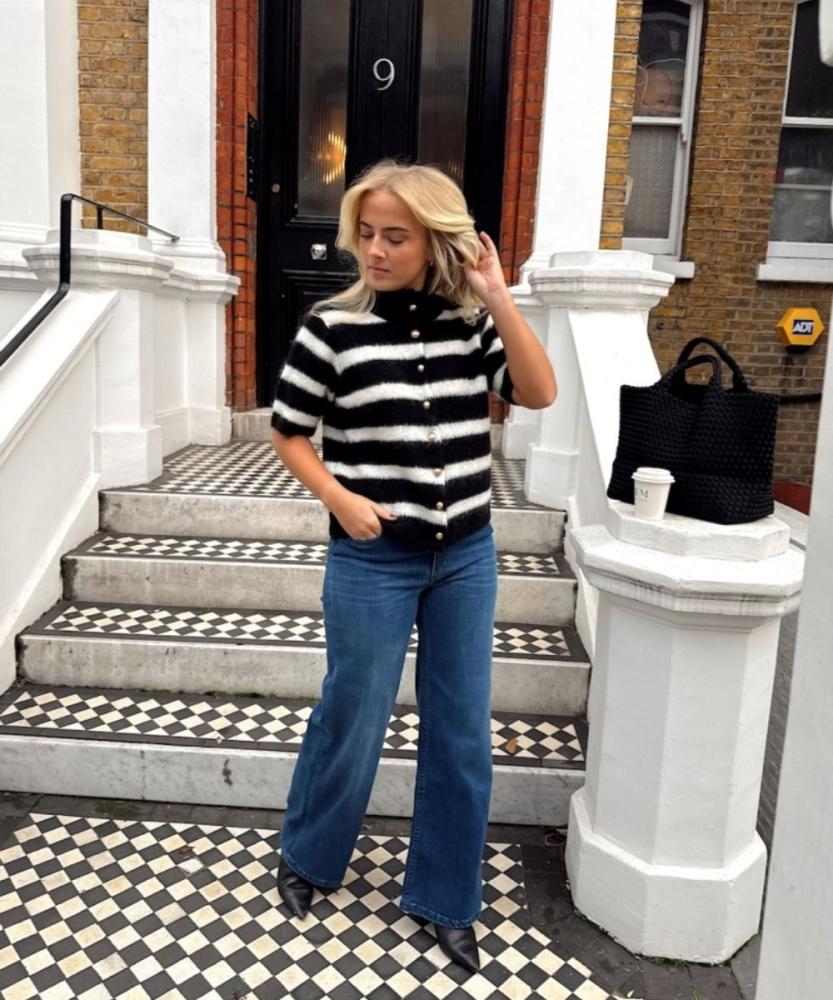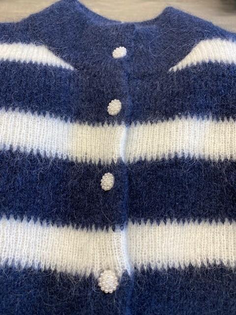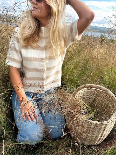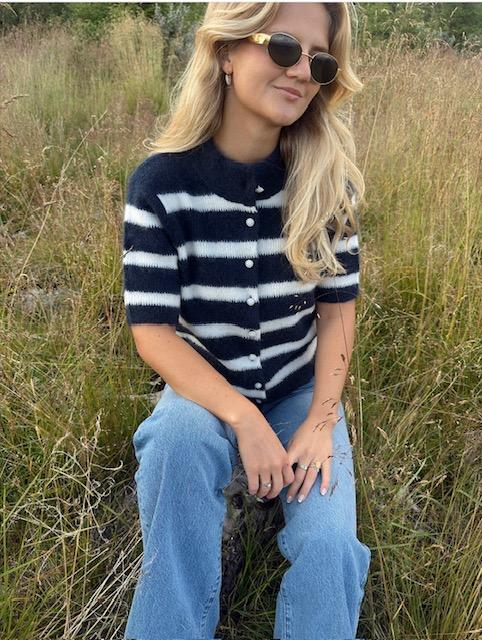 En herlig stripete myk og god kortermet strikkejakke med vakre perlebesatte knapper. Veldig tøff over skjorte, men også flott alene